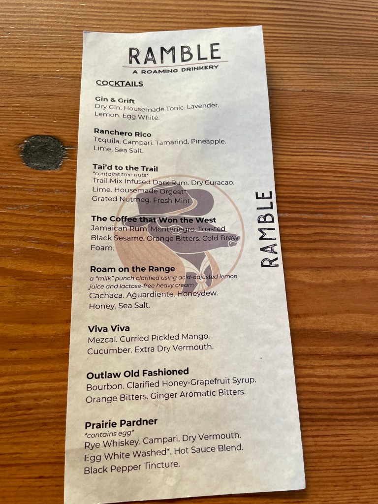 Other than a verb to describe the musings of some deranged, nearing middle aged man posting his Creed Thoughts about the Charlotte food and drink scene, Ramble is a traveling craft cocktail bar that establishes residency with local bars and restaurants for a few weeks at a time. The genius behind what these guys are doing lies in the menu. Not only have I never seen a drink menu this innovative, but this menu is so perfectly and intentionally curated to fit the vibe of the venue, the neighborhood, and the season. I mean look at this thing: